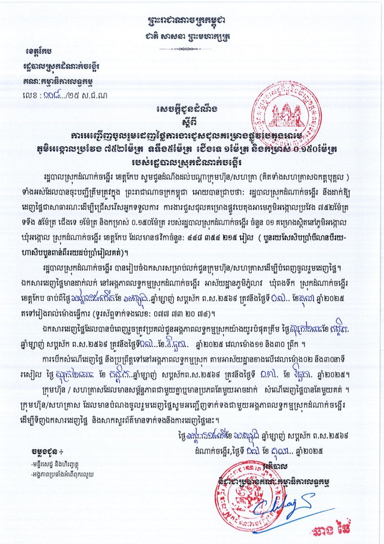 ព័ត៌មានជាតិ សេចក្តីជូនដំណឹង ស្តីពី ការអញ្ជើញចូលរួមដេញថ្លៃការងារជួសជុលគម្រោងផ្លូវបេតុងអាមេ ភូមិអង្គោលប្រវែង ៧៥២ម៉ែត្រ ទទឹង៥ម៉ែត្រ ជើងទេ ១ម៉ែត្រ និងកម្រាស់ ០.១៥០ម៉ែត្រ របស់រដ្ឋបាលស្រុកដំណាក់ចង្អើរ Uang Voeng 14 ខែតុលា 2025 ការនាំទិសប្រកាស រដ្ឋបាលស្រុកដំណាក់ចង្អើរ សូមជូនដំណឹង ស្តីពី ការអញ្ជើញចូលរួមដេញថ្លៃការងារ ជួសជុល របងសាលាស្រុក ប្រវែង ៤៦ ម៉ែត្រ និងប្រព័ន្ធលូមុខកាត់ ១ ម៉ែត្រ ប្រវែង១០០ម៉ែត្រសេចក្តីជូនដំណឹង ស្តីពី ការអញ្ជើញចូលរួមពិគ្រោះថ្លៃការផ្គត់ផ្គង់ ទំនិញសម្ភារ និងបរិក្ខារបច្ចេកទេសព័ត៌មានវិទ្យា អត្ថបទពាក់ព័ន្ធ សេចក្តីជូនដំណឹង ស្តីពី ការអញ្ជើញចូលរួមពិគ្រោះថ្លៃការផ្គត់ផ្គង់ ទំនិញសម្ភារ និងបរិក្ខារបច្ចេកទេសព័ត៌មានវិទ្យា 14 ខែតុលា 2025 រដ្ឋបាលស្រុកដំណាក់ចង្អើរ សូមជូនដំណឹង ស្តីពី ការអញ្ជើញចូលរួមដេញថ្លៃការងារ ជួសជុល របងសាលាស្រុក ប្រវែង ៤៦ ម៉ែត្រ និងប្រព័ន្ធលូមុខកាត់ ១ ម៉ែត្រ ប្រវែង១០០ម៉ែត្រ 19 ខែសីហា 2025