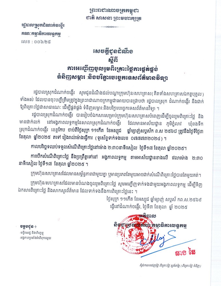 ព័ត៌មានជាតិ សេចក្តីជូនដំណឹង ស្តីពី ការអញ្ជើញចូលរួមពិគ្រោះថ្លៃការផ្គត់ផ្គង់ ទំនិញសម្ភារ និងបរិក្ខារបច្ចេកទេសព័ត៌មានវិទ្យា Uang Voeng 14 ខែតុលា 2025 ការនាំទិសប្រកាស សេចក្តីជូនដំណឹង ស្តីពី ការអញ្ជើញចូលរួមដេញថ្លៃការងារជួសជុលគម្រោងផ្លូវបេតុងអាមេ ភូមិអង្គោលប្រវែង ៧៥២ម៉ែត្រ ទទឹង៥ម៉ែត្រ ជើងទេ ១ម៉ែត្រ និងកម្រាស់ ០.១៥០ម៉ែត្រ របស់រដ្ឋបាលស្រុកដំណាក់ចង្អើរ អត្ថបទពាក់ព័ន្ធ សេចក្តីជូនដំណឹង ស្តីពី ការអញ្ជើញចូលរួមដេញថ្លៃការងារជួសជុលគម្រោងផ្លូវបេតុងអាមេ ភូមិអង្គោលប្រវែង ៧៥២ម៉ែត្រ ទទឹង៥ម៉ែត្រ ជើងទេ ១ម៉ែត្រ និងកម្រាស់ ០.១៥០ម៉ែត្រ របស់រដ្ឋបាលស្រុកដំណាក់ចង្អើរ 14 ខែតុលា 2025 រដ្ឋបាលស្រុកដំណាក់ចង្អើរ សូមជូនដំណឹង ស្តីពី ការអញ្ជើញចូលរួមដេញថ្លៃការងារ ជួសជុល របងសាលាស្រុក ប្រវែង ៤៦ ម៉ែត្រ និងប្រព័ន្ធលូមុខកាត់ ១ ម៉ែត្រ ប្រវែង១០០ម៉ែត្រ 19 ខែសីហា 2025