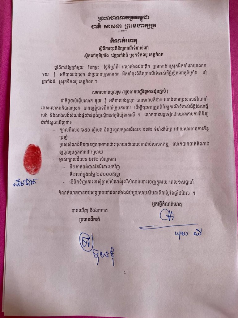 សម្គាល់៖ រដ្ឋបាលស្រុកទឹកឈូ នឹងបន្តតាមដានករណីនេះយ៉ាងដិតដល់បំផុត ដើម្បីធានាឱ្យបាននូវដំណោះស្រាយប្រកបដោយបរិយាបន្ន និងបញ្ចប់ជម្លោះក្នុងរយៈពេលដែលបានគ្រោងទុក ៕